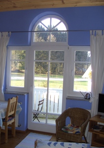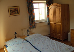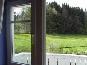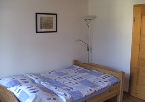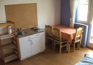 Ein Fremdenzimmer mit 1,40 m breitem Bett, gut ausgestatteter Miniküche, Essecke, Fernseher und Balkon. |