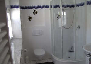 Das zugehörige Bad liegt gleich auf dem Flur gegenüber und steht zur alleinigen Nutzung zur Verfügung. |